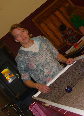 They keep us pretty busy - we study for like 6 hours or so a day, plus devotions, chapel, a couple classes, a practice 5-day-club (well, actually a real one, only WE'RE the kids), and we get an hour of "recreation" every evening - some evenings we all go down to an outdoor basketball court, and sometimes we go to an indoor rec. room (the whole training is held on a campground) - this is me playing "Carpet Ball" with Hosanna. (Mom here - no, Naomi does not have black eyes! I tried to edit out the red and it did an awful job and I didn't notice that before Naomi posted this!)